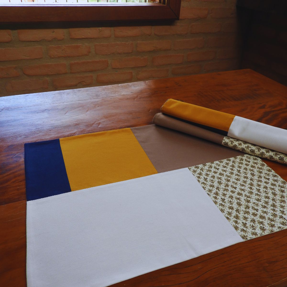 Confeccionados em tecido algodão, os jogos combinam estampas de cores vibrantes e atuais, bege, mostarda, marrom e azul escuro, criando um contraste visual organizado e atemporal. O patchwork é aplicado de forma limpa e precisa, valorizando o desenho dos tecidos e reforçando a proposta contemporânea sem excessos.